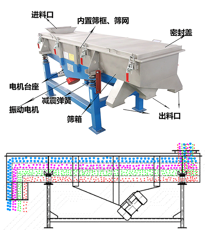 直線篩于直線振動篩是一樣的產(chǎn)品其結(jié)構(gòu)可簡單分為:進(jìn)料口、篩機(jī)蓋、篩板、出料口、彈簧和電機(jī)。