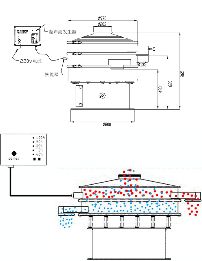 超聲波振動篩結(jié)構(gòu)和旋振篩機(jī)構(gòu)相同,只不過是在旋振篩的基礎(chǔ)上加裝了超聲波振動裝置。超聲波振動裝置可以使超聲波振動篩的篩分效率高出很多。
