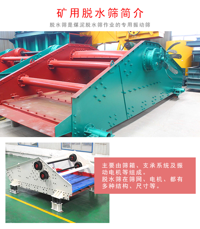 礦用脫水篩是煤泥脫水作業的專用振動篩,它廣泛適用于選煤、電力、選礦、制鹽、化工、制糖等行業中的細粒度干式、濕式篩分煤泥回收,過濾隔粗、壓濾隔粗、其他極細物料的脫水、過濾隔粗脫水、脫介、脫泥回收等工藝中。