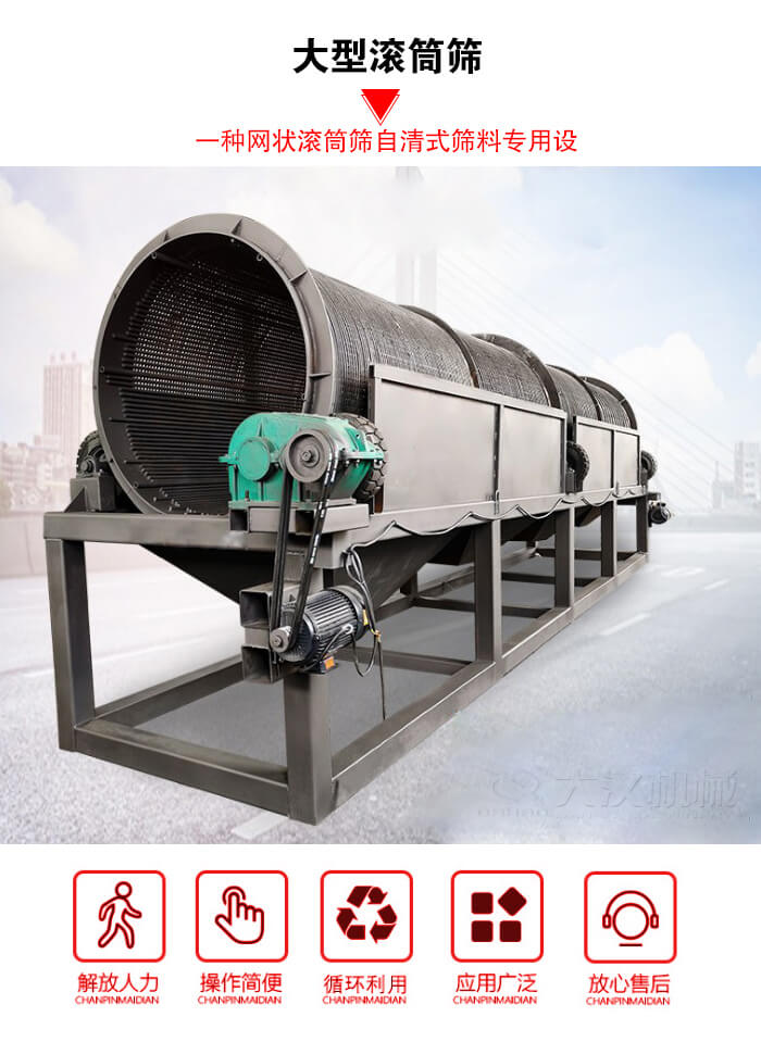 大型滾筒篩,因其獨特的結(jié)構(gòu)特點,完全有效地解決了其他型式篩分設備所存在的缺點,是綜合利用電站的篩型。是繼國內(nèi)各大公司生產(chǎn)的普通型網(wǎng)狀滾筒篩之后的自清式篩料專用設備。